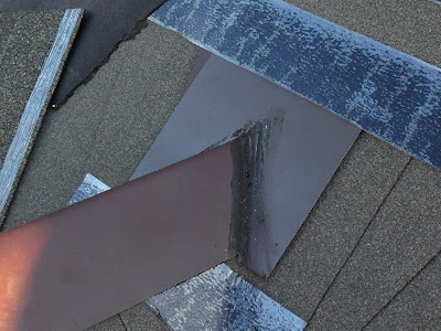 Then I cut a piece of 9" flat aluminum stock about 12" long. I cut a V-shape out of one end, and lay it down over top the first piece of flashing. I then put a generous amount silicone sealant along the seam where the two pieces overlap.